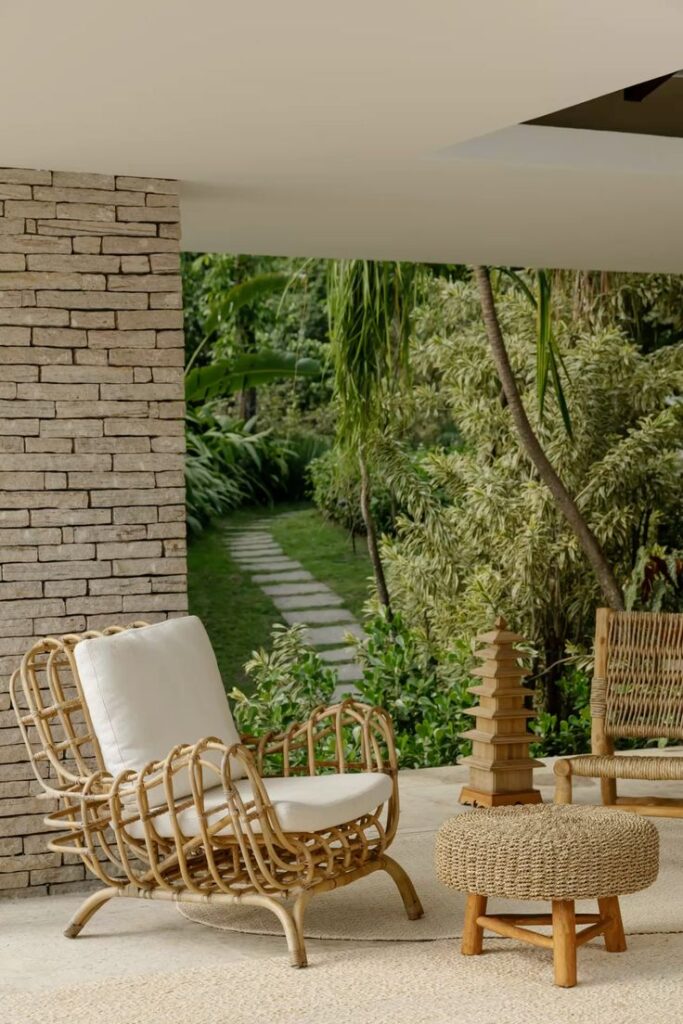 Materials are central. Wood, stone, woven fibers, natural textiles—all these speak to biophilic principles. They age visibly, respond to light and touch. A teak table slowly silvering outdoors, a rattan lounge softening, linen cushions fading—these aren’t flaws. They’re part of the story, the experience. Surfaces do not pretend permanence; they evolve.