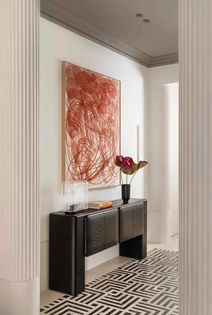 Hallway. Keep it lean. One lamp, one object, done. A narrow hallway can’t absorb visual noise the way a living room can. Let the table itself do the work — a strong piece in a hallway doesn’t need much on top of it. If the hallway is long, consider two smaller consoles rather than one large one.