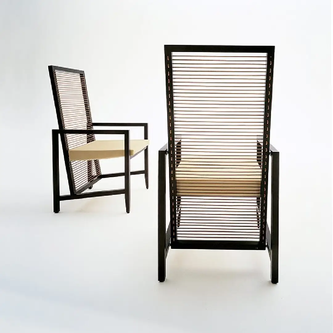 Its defining silhouette is shaped by a tall, upright backrest that commands presence without imposing — woven with fine horizontal strands that run edge to edge within the walnut frame, creating a panel of quiet texture and remarkable lightness. The clean, angular geometry of the frame speaks to a modernist sensibility, with open arms that extend forward in a single, deliberate line and angled rear supports that give the chair a sense of dynamic poise. Every detail is intentional — from the precise joinery of the walnut frame to the way the woven back catches and filters light across its surface.