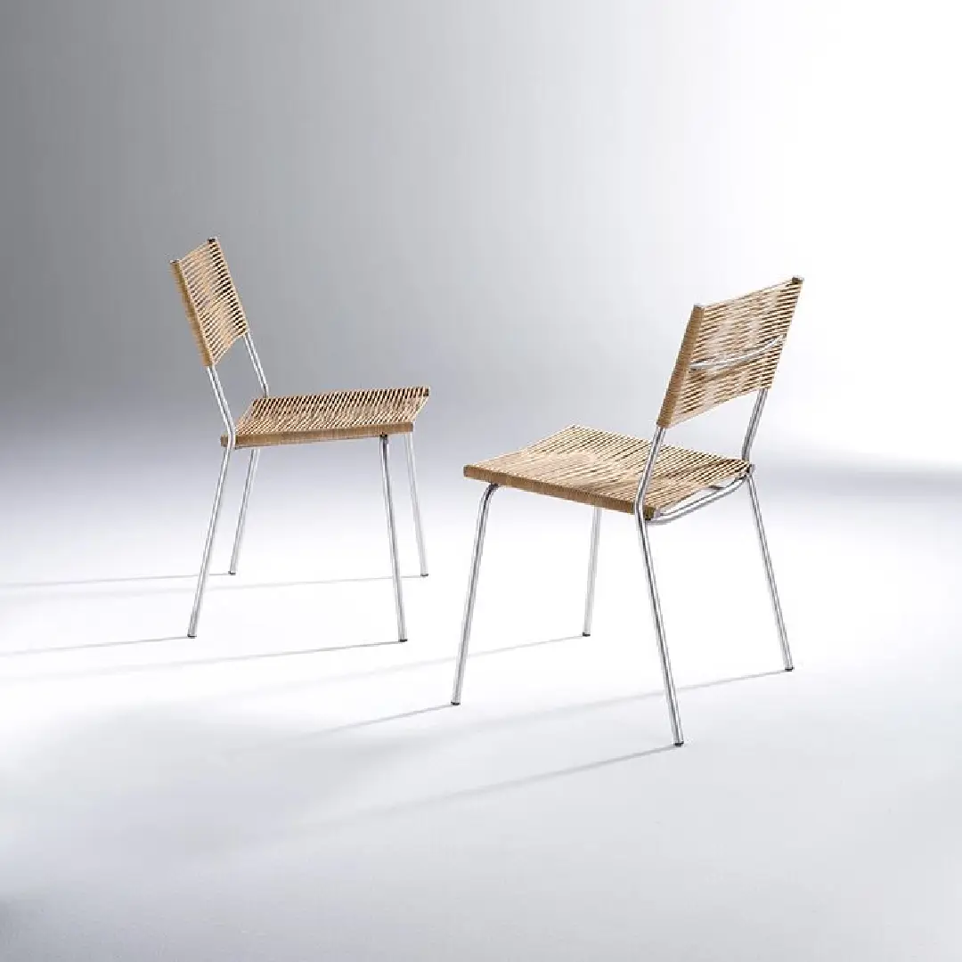A meeting of polished steel and hand-woven rattan, the Miss B Chair by Bonacina is a study in quiet contrast. Its slender tubular frame and finely woven seat and backrest bring together industrial precision and artisanal warmth — a compact, timeless chair that earns its place in any interior.