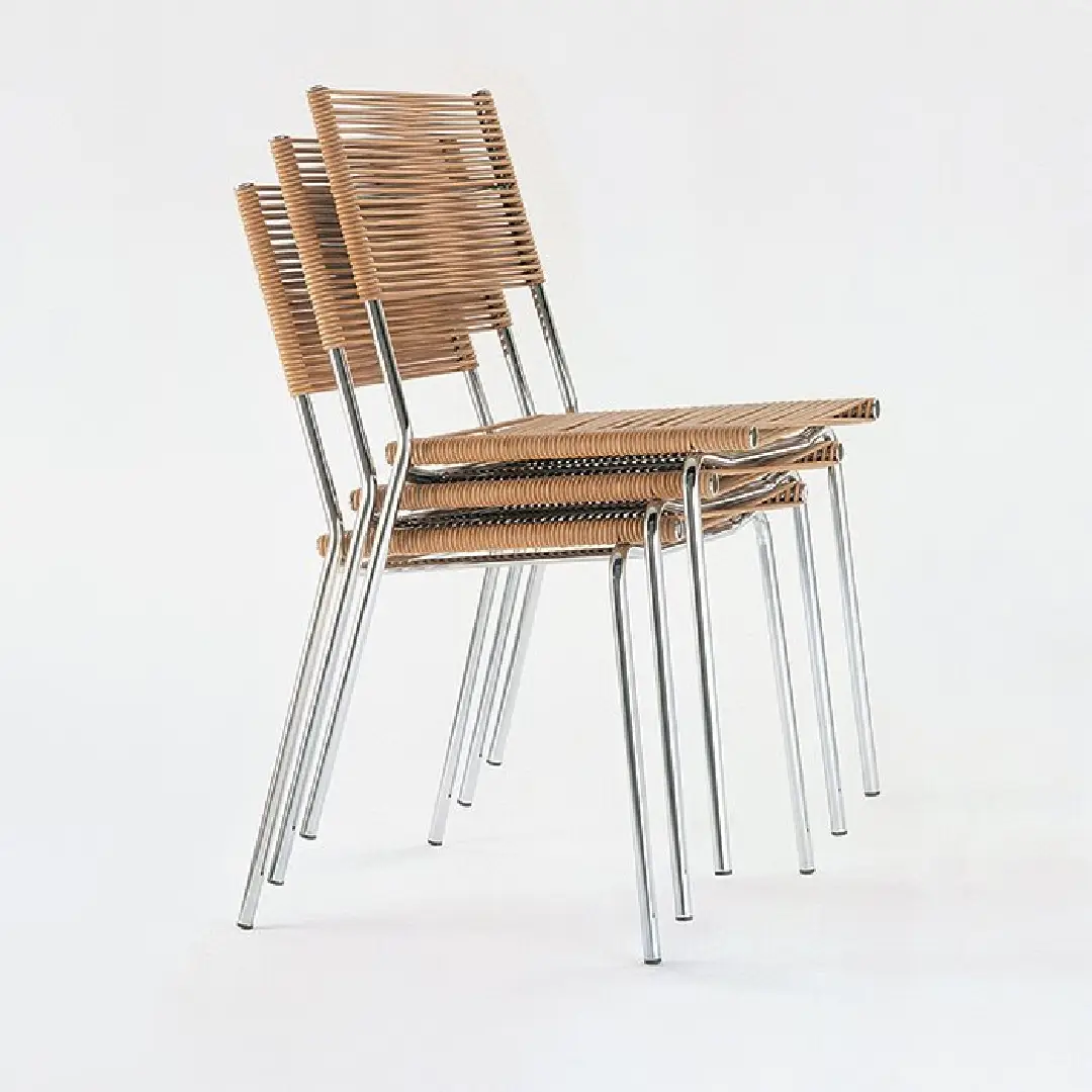 Its defining silhouette is shaped by a slender, tubular steel frame — four clean legs that taper to the floor with the kind of effortless lightness that only true simplicity achieves. Set within this minimal structure, the woven rattan seat and backrest introduce warmth, texture, and a sense of artisanal care that softens the industrial edge of the metal beneath. Every detail is intentional — from the tight, horizontal weave that speaks to a tradition of skilled handcraft to the open gap at the backrest that gives the piece an airy, unencumbered quality.