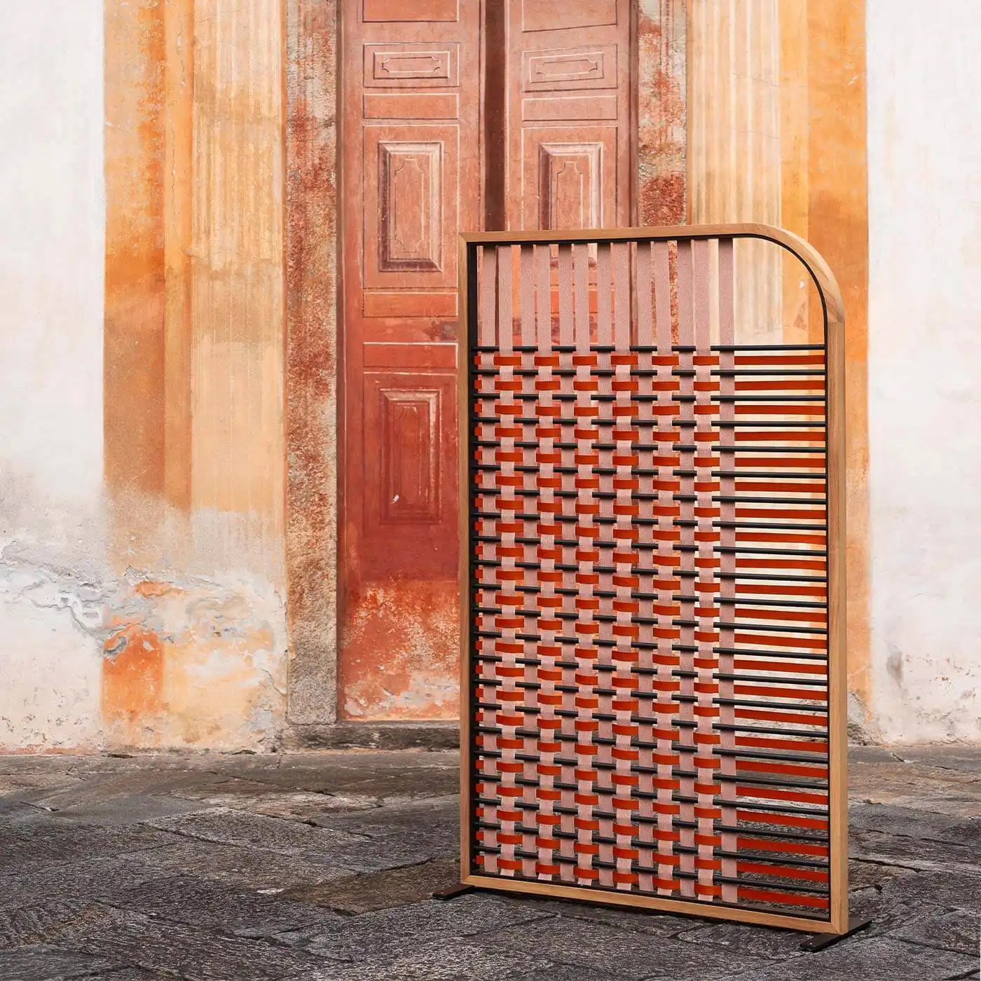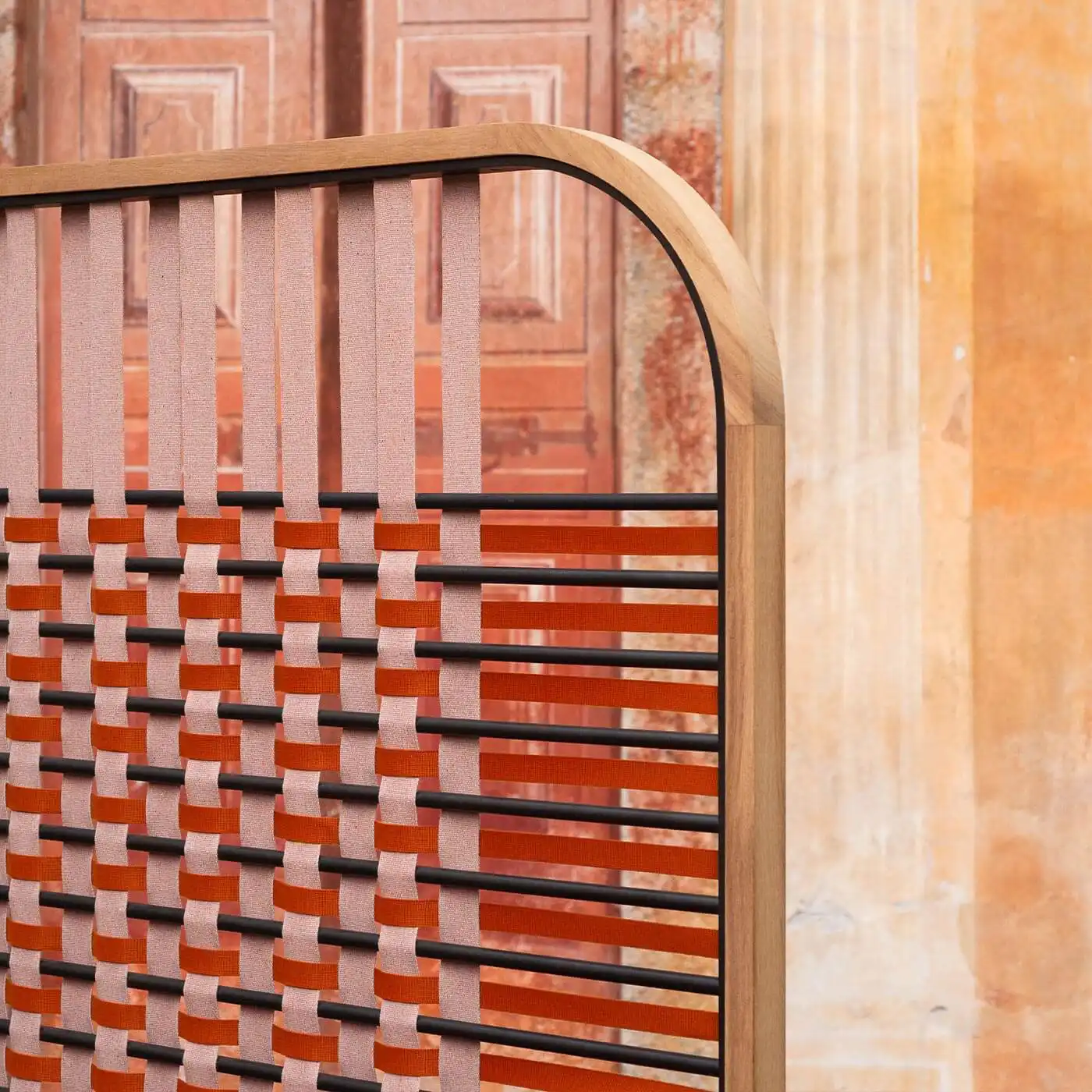 Designed in collaboration with UnPIZZO, the Roda Filet is an outdoor divider available in vertical and horizontal versions. Built from Iroko wood, powder-coated aluminum, and stainless steel feet, it uses woven polyester or acrylic belts to define outdoor spaces with color and structure.