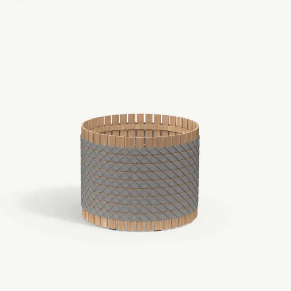 The Barrique planter doesn’t try to be decorative in the conventional sense. Structure and surface work as one here. The Iroko wood slats — available in narrow or wide configurations — give the piece its form, while the cord and belt wrapping adds texture and a quietly handcrafted quality. It reads as considered, not overdone.