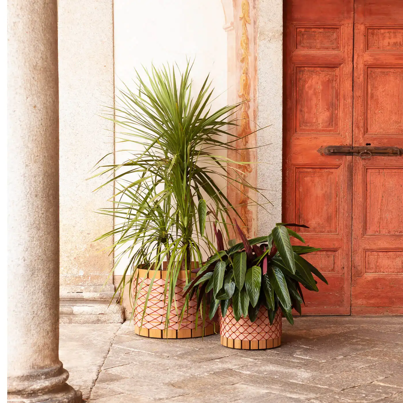 The Barrique planter does not try to disappear into the background. It has a presence. The design by UnPIZZO treats structure and decoration as one continuous idea — the wood is not just holding things together, it is part of the visual language. Narrow or wide slats, wrapped with cords or belts, give each piece a handcrafted quality that feels considered rather than decorative for its own sake.