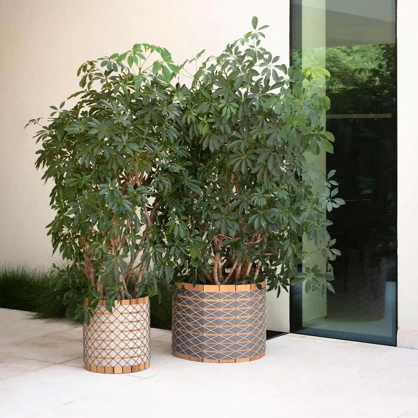 The Barrique planter by Roda blends Iroko wood with hand-wrapped cords and belts in a wide range of colors. Available in multiple sizes with narrow or wide slats, it brings an artisan, sculptural quality to any outdoor setting.