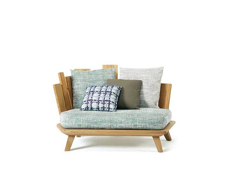 The cushions of the Rafael Lounge Armchair play a pivotal role in its design, featuring a range of textures and shades that contribute to its visual and tactile appeal. Designed by Paola Navone, the textile colors are carefully curated to enhance the padded furniture, creating a harmonious dialogue between the cushions and the teak structure.