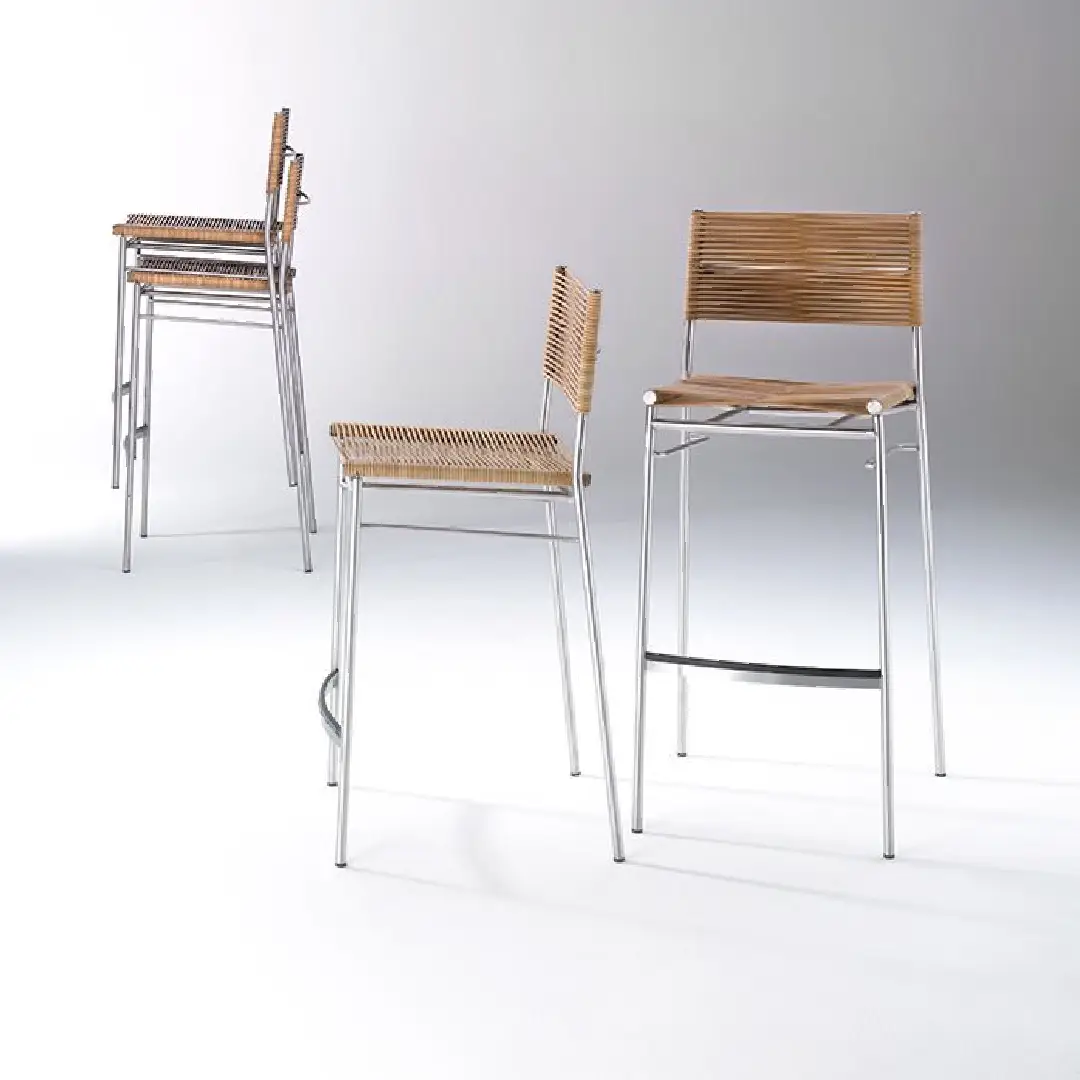 The Miss B Stool by Bonacina translates the same quiet elegance of its classic chair into a sleek bar-height form. Polished steel legs rise to a hand-woven rattan seat and backrest, with a slim footrest completing the picture — a stackable, characterful stool that brings timeless craft to the counter.