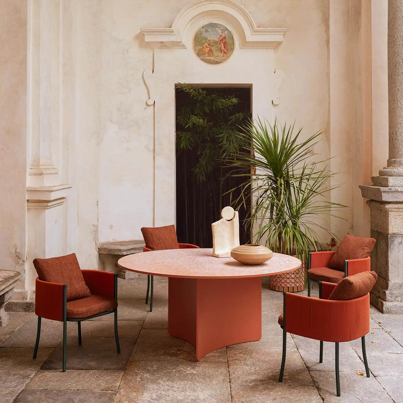 The Saddle chair was designed specifically to slide under Roda tables when not in use. That is not a minor detail. In outdoor dining areas, terraces, or any space where tidiness matters, a chair that stores itself cleanly under the table is genuinely useful. It keeps the space looking composed even between meals or gatherings.