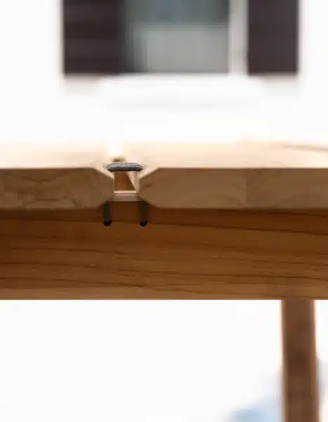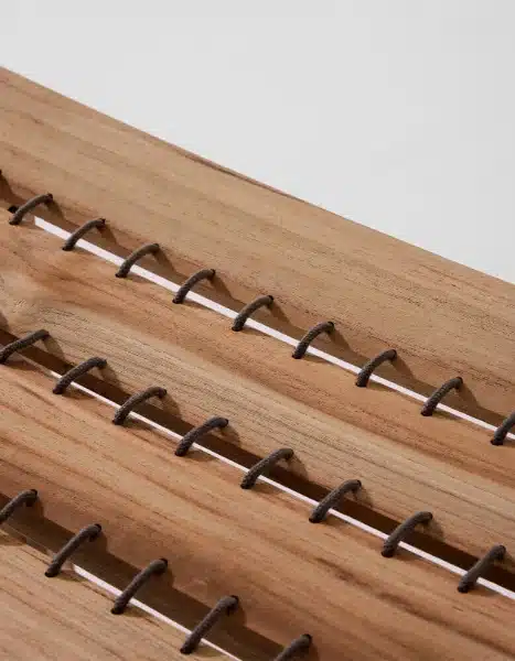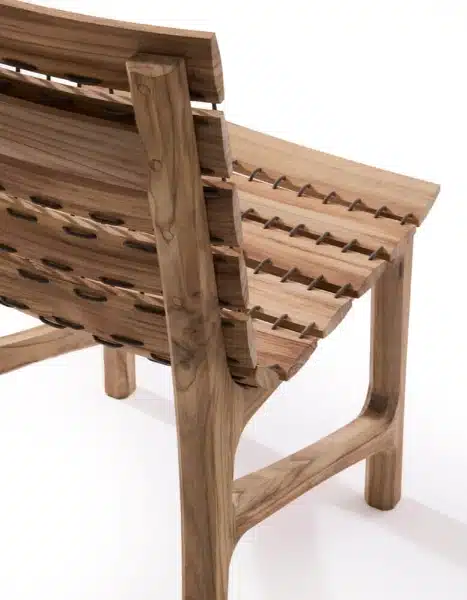 The frame is FSC-certified teak, which means the wood is responsibly sourced and genuinely built for outdoor conditions. Teak is dense, naturally resistant to moisture, and ages well without losing its structural integrity. The cord running through the slats is 3mm polyester — thin enough to look precise, strong enough to hold up over years of use.</p><p>This is not a chair that hides its construction. The stitching is the detail. It is visible, deliberate, and central to what makes the Teseo collection recognizable.</p>