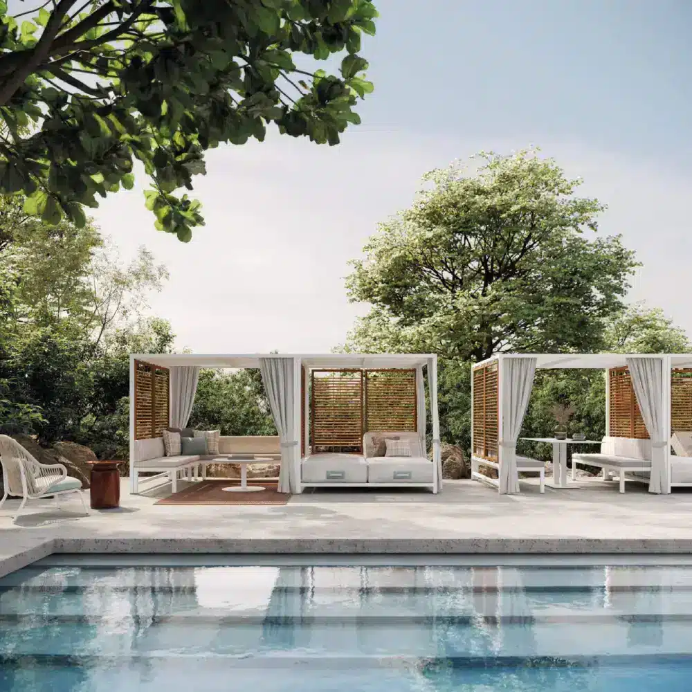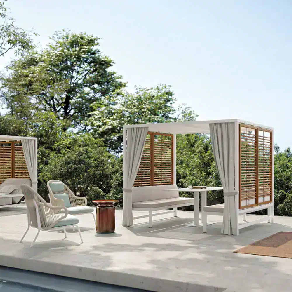 Crafted with a solid aluminum structure, the Alcova is built for durability and stability, ensuring it withstands various weather conditions while maintaining its stylish appeal. The design emphasizes customization, allowing you to tailor each Alcova space to your specific needs and preferences.