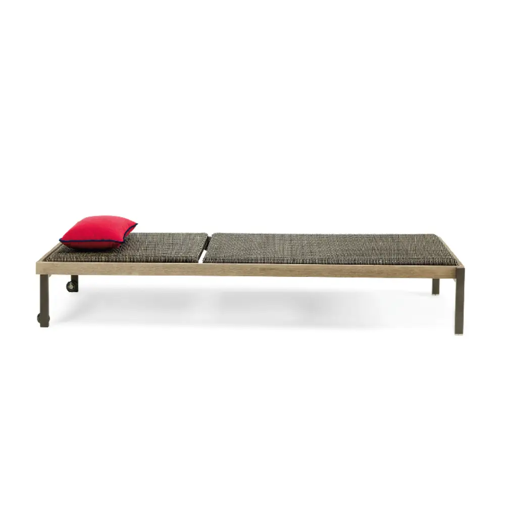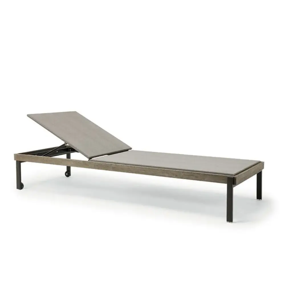 The Allaperto Urban Sunbed infuses contemporary settings with a dynamic mix of materials including metal, pickled teak, and innovative techno fabrics like Batyline and Canatex Cappuccino.