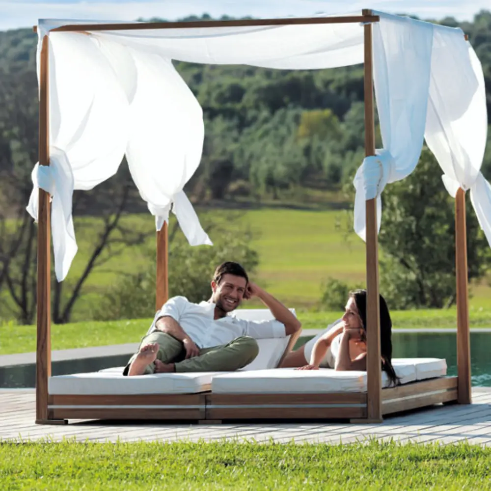 A defining feature of the Essenza double canopy is the integration of brushed steel details within the teak frame. This combination of materials brings a unique fusion of technology and nature to the forefront. The teak wood, known for its durability and timeless charm, is complemented by the sleek, contemporary accents of brushed steel.