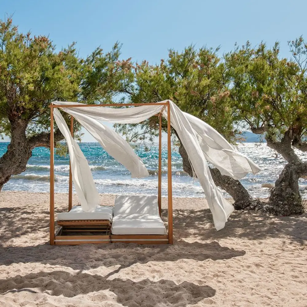 The Essenza double canopy embodies a natural harmony of lines and volumes, seamlessly integrating with the outdoors to provide a versatile solution for both relaxation and living. At its core, the collection celebrates the balance between nature and modernity, creating an environment where aesthetics and functionality coexist effortlessly.