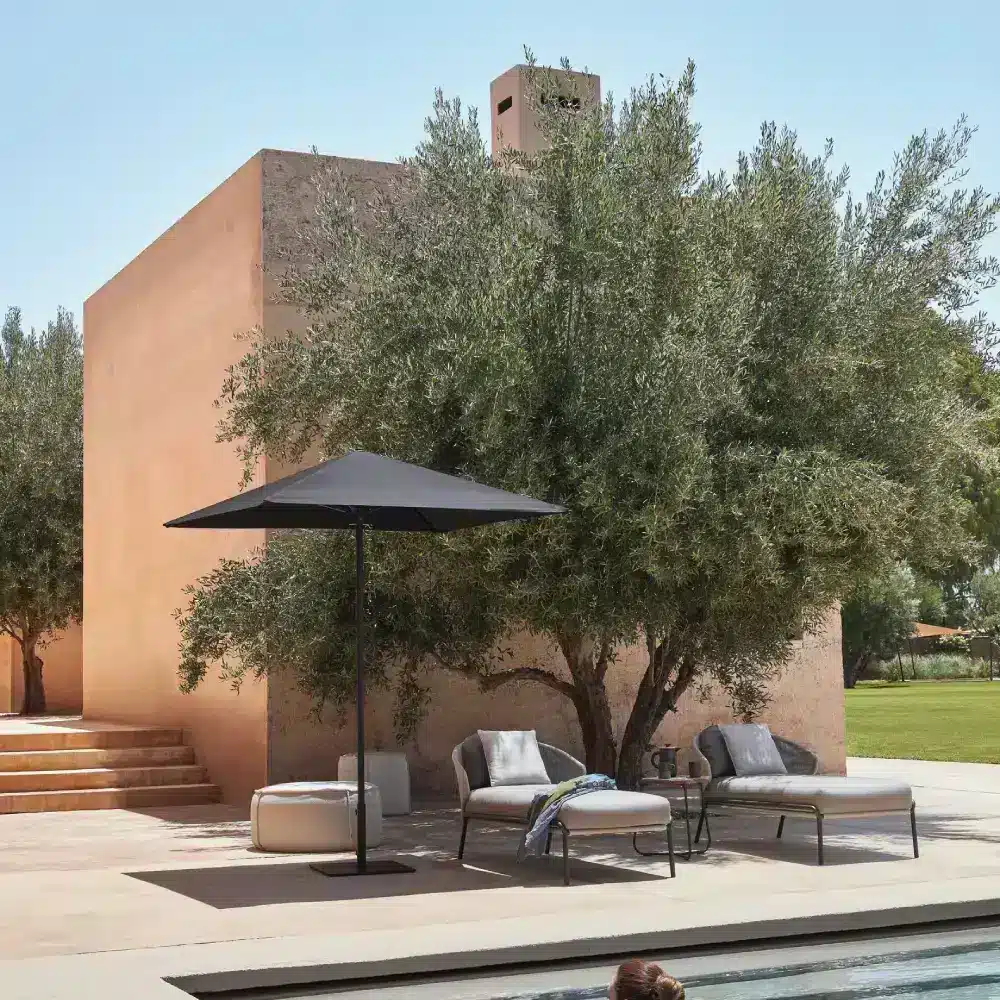 These parasols are available with different types of bases and a wide array of colors that draw inspiration from nature, allowing them to seamlessly fit into any outdoor decor.