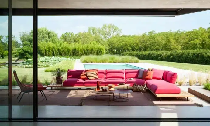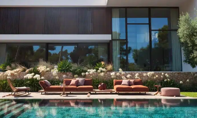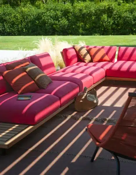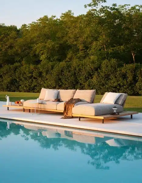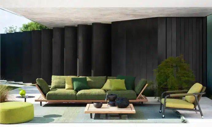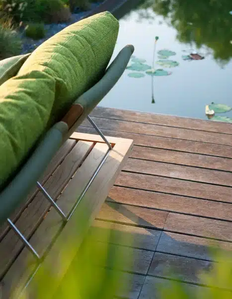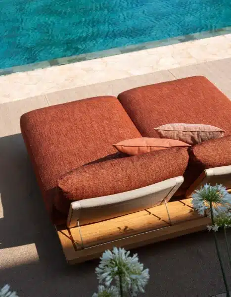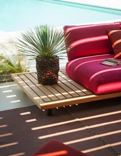 FSC-certified teak is one of the more durable hardwoods available for outdoor use. Combined with powder-coated stainless steel feet and Batyline or belt supports rated for outdoor conditions, the Philia table is built for years of use without significant maintenance. Roda’s approach here isn’t about trends. It’s about furniture that holds up — in quality and in appearance — season after season.