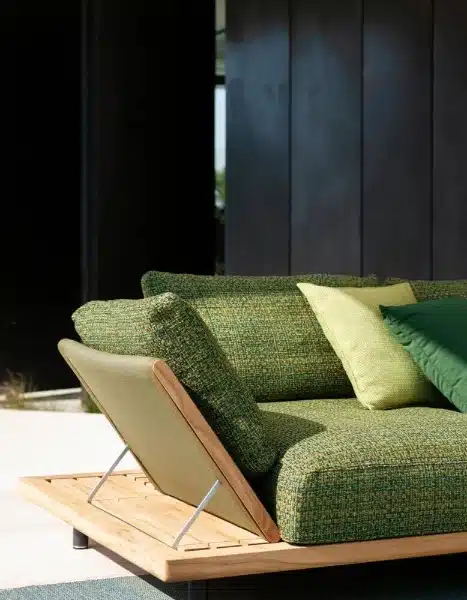 The frame is FSC-certified teak — sourced responsibly, and chosen because it handles sun, rain, and salt air without complaint. The feet are powder-coated stainless steel, finished in smoke, which keeps the base from looking too heavy against the teak grain.Depending on the configuration, the support belts come in Batyline or woven belt options, with a wide range of colors: Grey, Sand, Brown, Olive, Blue, Orange, Sky, Navy, and Ginger. Batyline in particular is a material that holds its color and structure well over time — it doesn’t sag or fade the way lesser outdoor materials do.