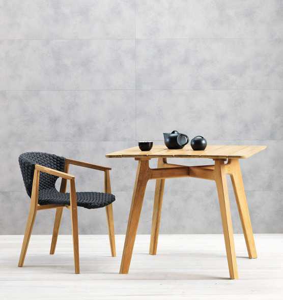 Central to the Knit Square Table’s allure is its sophisticated use of premium teak and intricately woven rope. The teak’s deep, natural tones offer a rich foundation, while the rope’s artisanal weave adds a layer of delicate texture and visual intrigue.