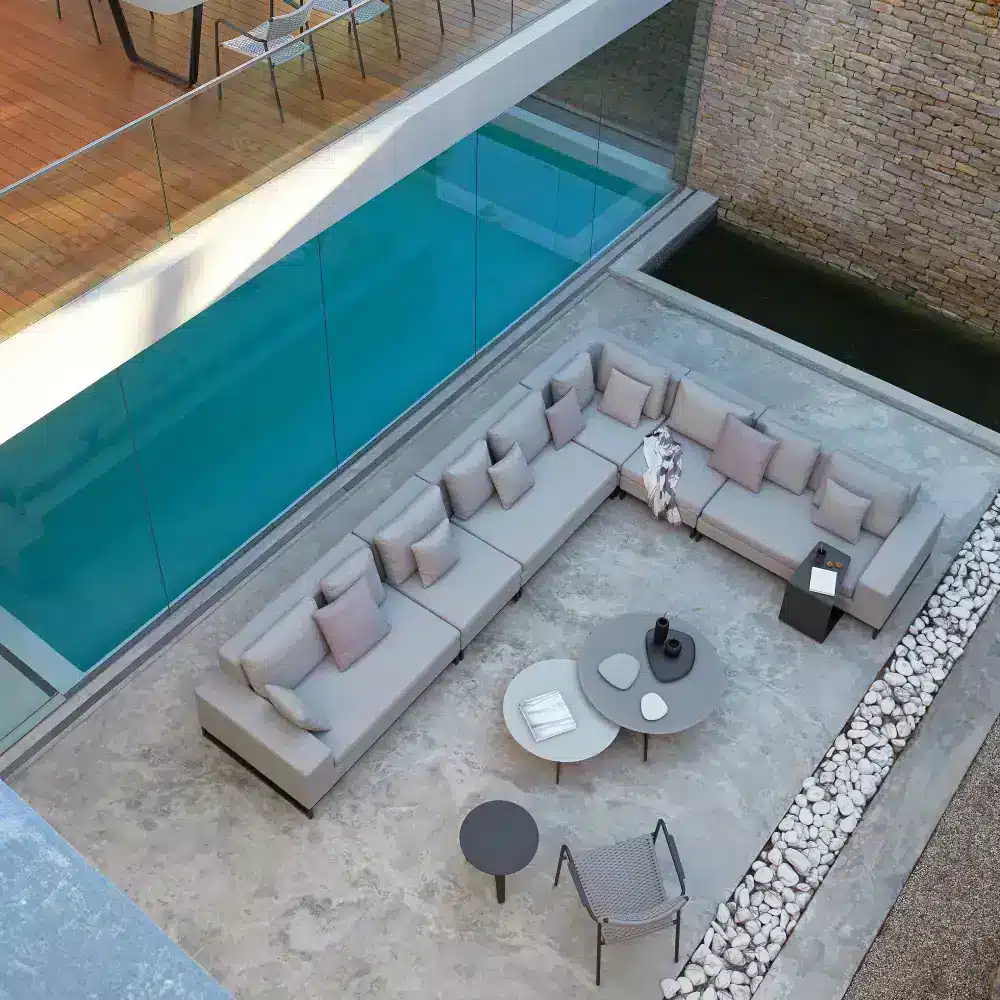 The Ocean Round Dining Table’s design is also inherently versatile. Its clean lines and sophisticated structure allow it to complement a variety of outdoor décors, from modern minimalist to more traditional setups. The lounger’s neutral metal finish pairs well with different textiles and cushions, offering further customization to match your personal style.