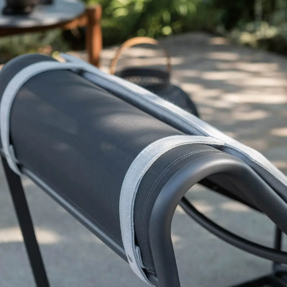 The seat and backrest of the Wind Chaise Longue are made from high-quality technical fabric, specifically micro heat-sealed Textilene, available in elegant white or black. This innovative material is designed for outdoor use, offering both comfort and resilience. Its breathable nature ensures a pleasant lounging experience, while the micro heat-sealing technique provides added durability, preventing wear and tear from sun exposure and moisture.